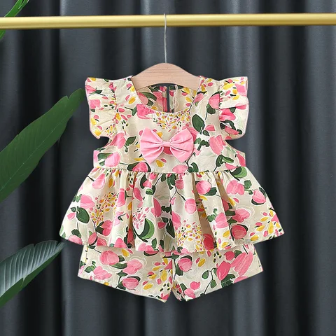 Summer Sleeveless Baby Girls Jumpsuit With Floral Print Short Skirt - Cute Fashion Set