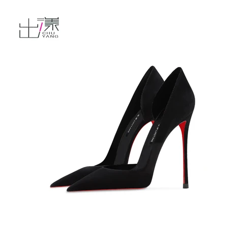 Versatile black pointed high heels for women with slim heels and side clearance design