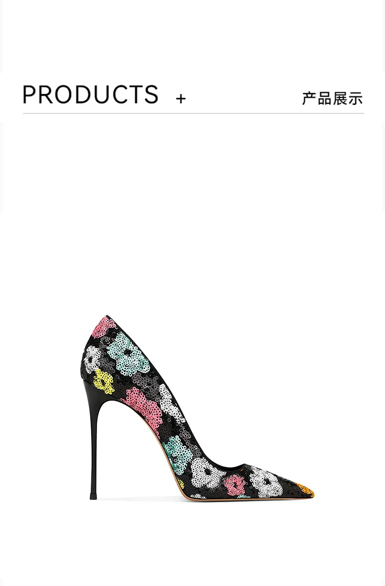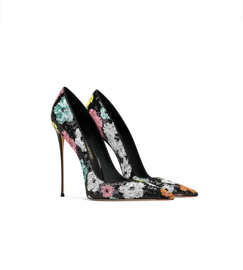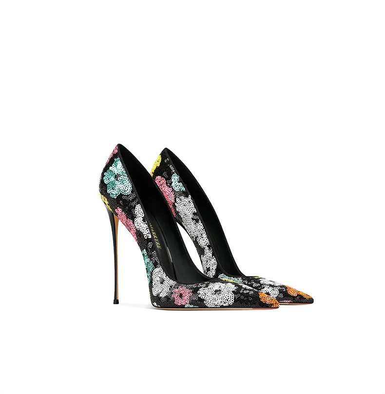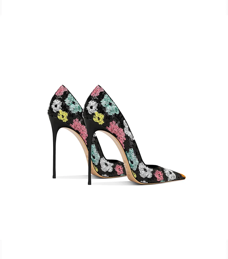Elevate your style with these black sequined high heels featuring pointed toes and thin heels. The perfect choice for a modern princess look in the upcoming spring season.