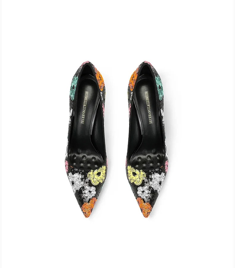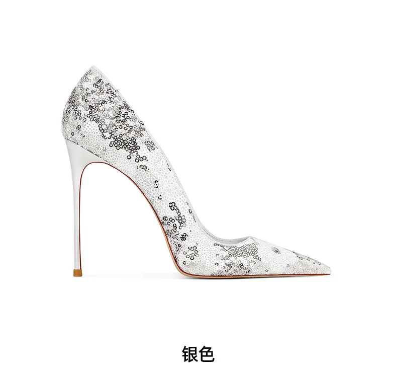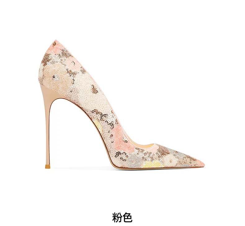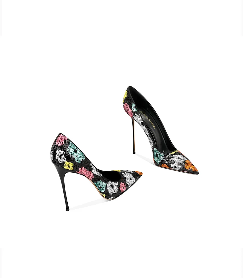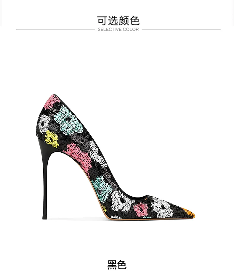 Elevate your style with these black sequined high heels featuring pointed toes and thin heels. The perfect choice for a modern princess look in the upcoming spring season.